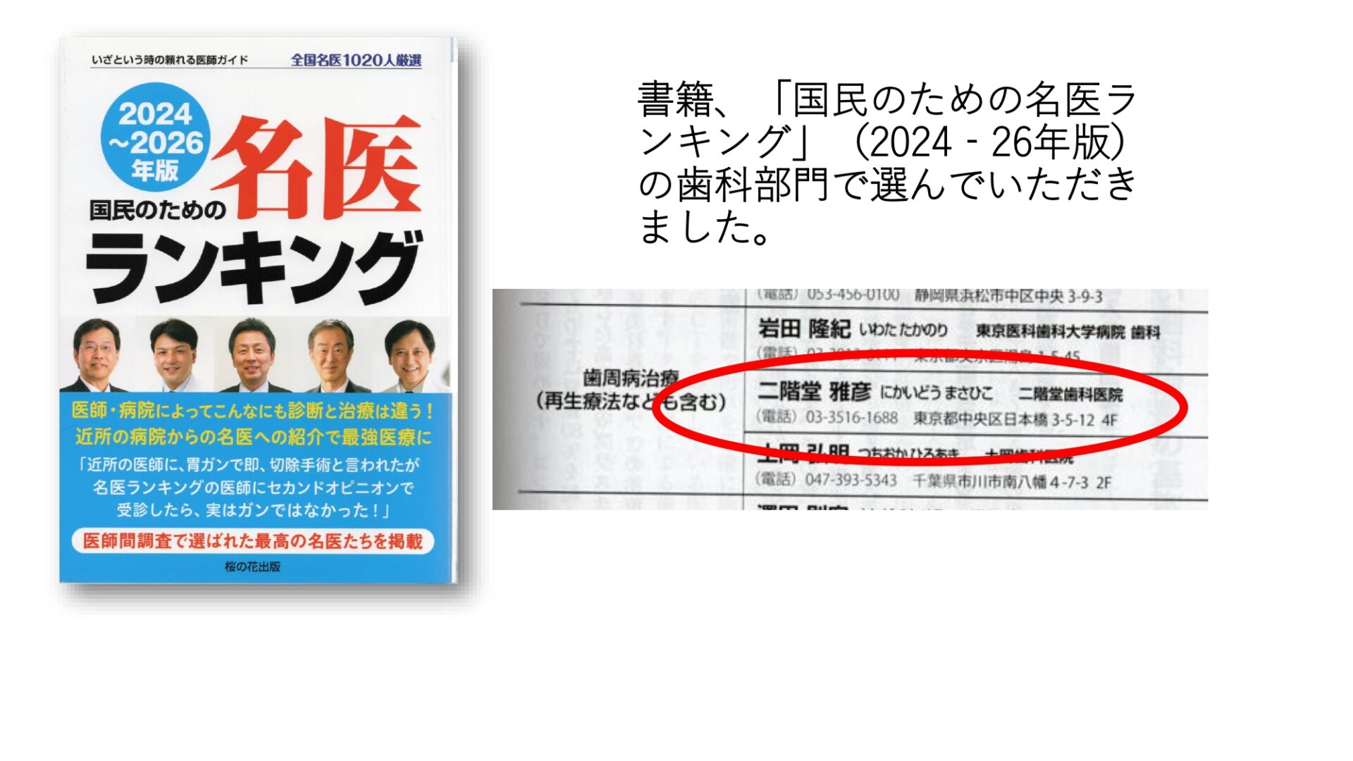 2026年度版の書籍「国民のための名医ランキング」(2024‐26年版)に歯科部門で選んでいただきました。