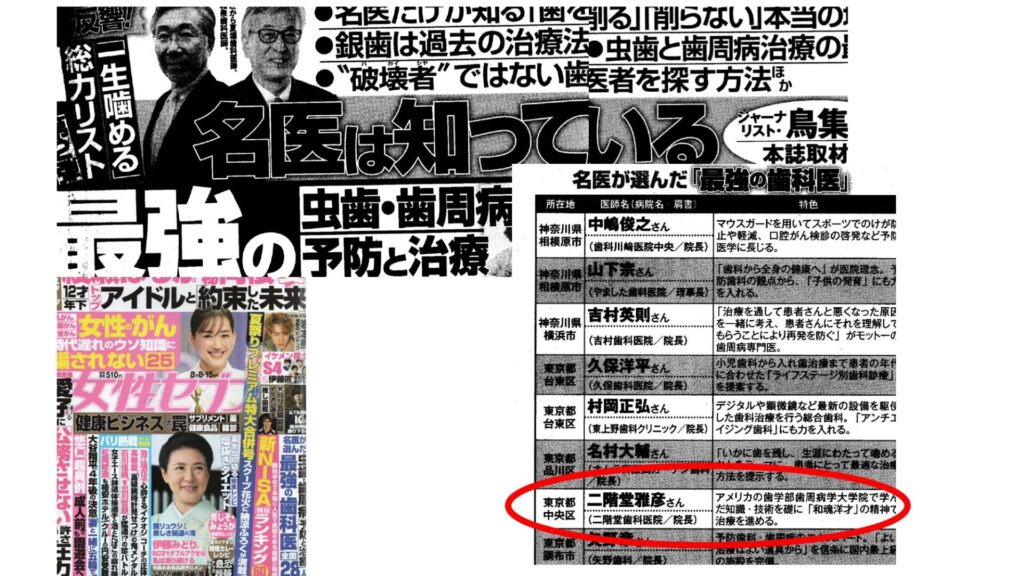 雑誌『女性セブン』にて「歯周病部門」の歯科医に選出されました お知らせ2026.02.12 「女性セブン」2024年8月15日号、「名医は知っている 最強の歯科医」の歯周病部門で選んでいただきました。 書籍『国民のための名医ランキング 2024~2026』に掲載されました 一覧へ