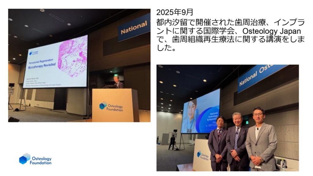 Osteology Japanでの講演 活動報告2026.02.09 2025年9月 都内汐留で開催された歯周治療、インプラントに関する国際学会、Osteology Japanで、歯周組織再生療法に関する講演をしました。 アメリカ歯周病学会での講演 一覧へ